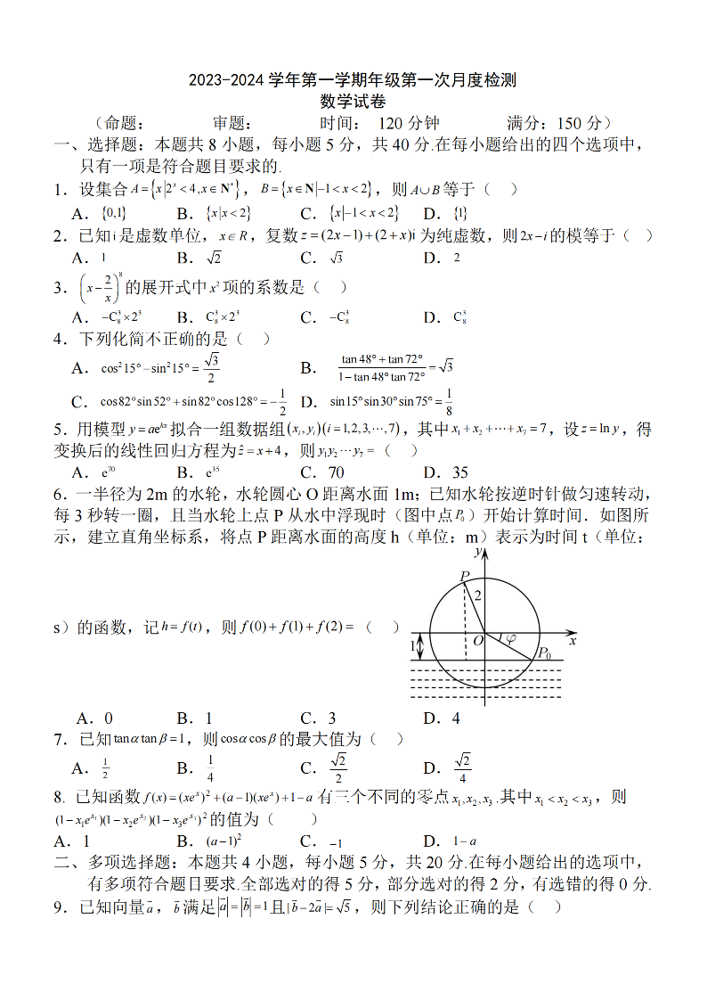【数学试题+答案】泰州中学24届高三第一次质量检测