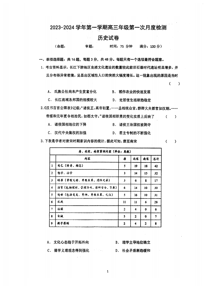 【历史试题+答案】泰州中学24届高三第一次质量检测