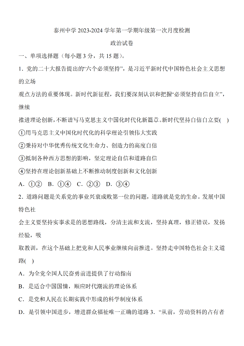 【政治试题+答案】泰州中学24届高三第一次质量检测