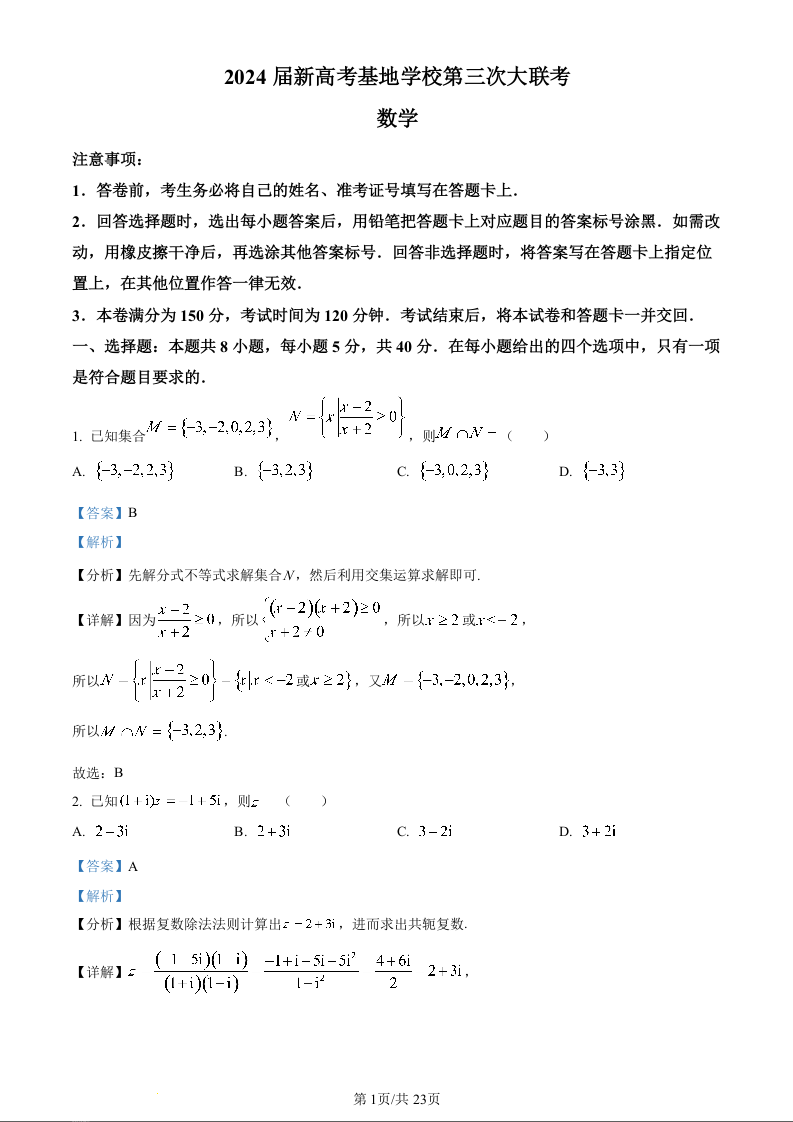 江苏省新高考基地学校2023-2024学年高三上学期第三次大联考 数学答案