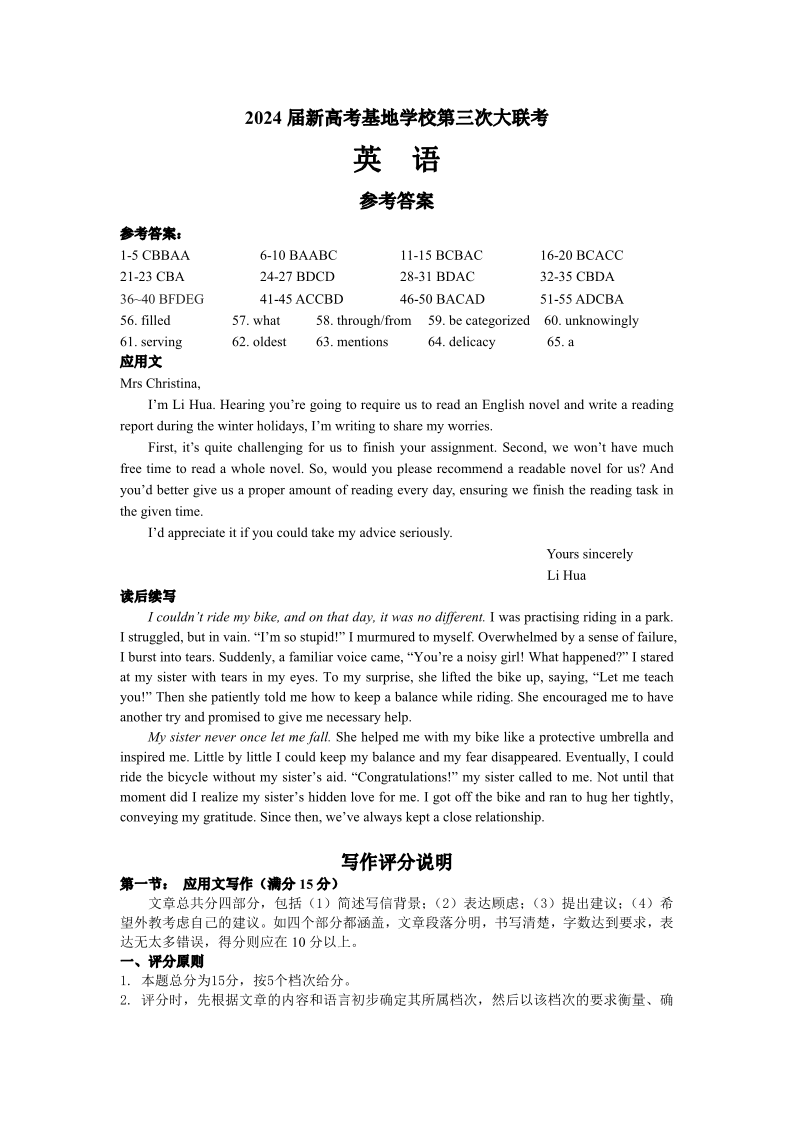 江苏省新高考基地学校2023-2024学年高三上学期第三次大联考 英语答案