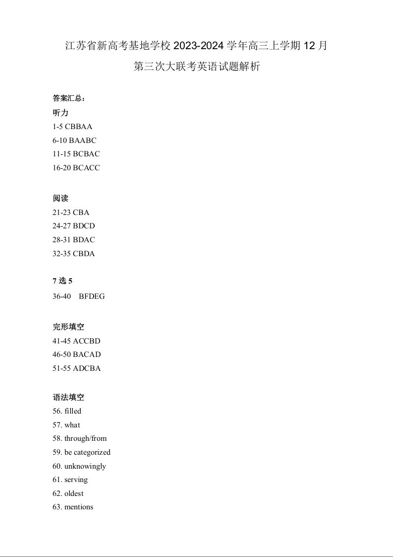 江苏省新高考基地学校2023-2024学年高三上学期第三次大联考 英语解析