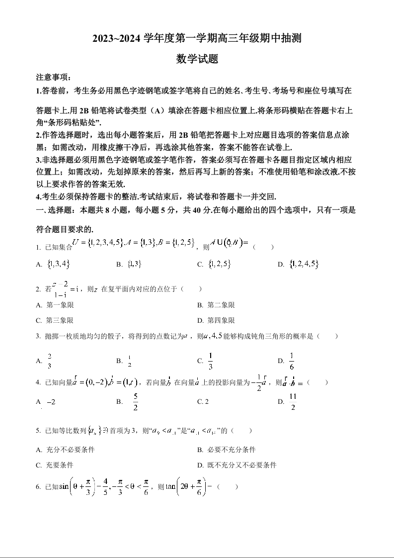 江苏省徐州市2023-2024学年高三上学期11月期中考试 数学
