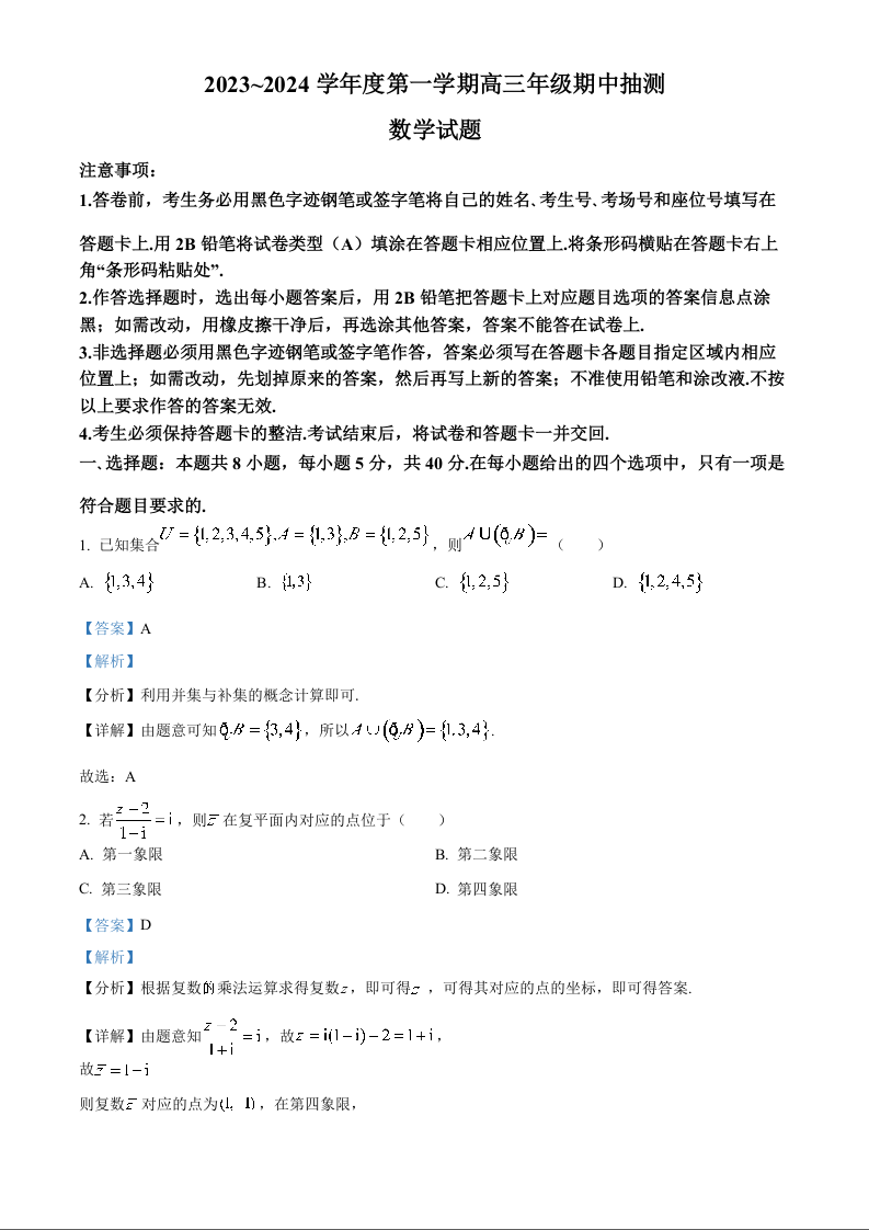 江苏省徐州市2023-2024学年高三上学期11月期中考试 数学答案