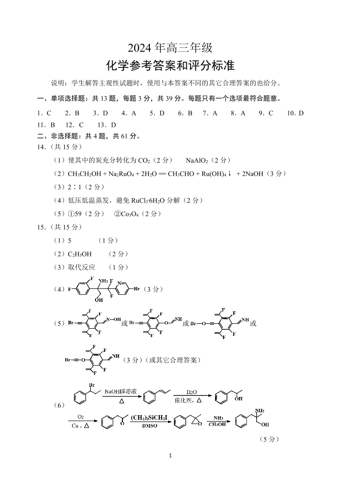 江苏省徐州市2024届高三下学期6月考前打靶试题+化学答案