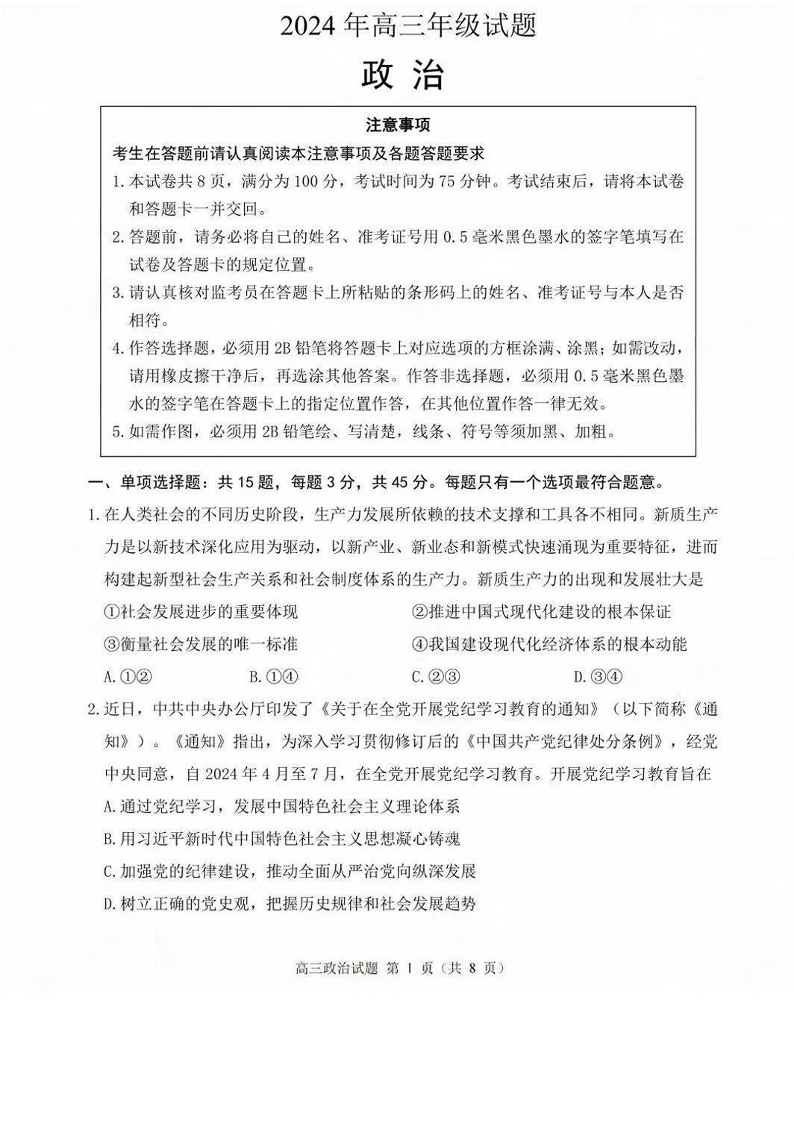 江苏省徐州市2024届高三下学期6月考前打靶试题+政治