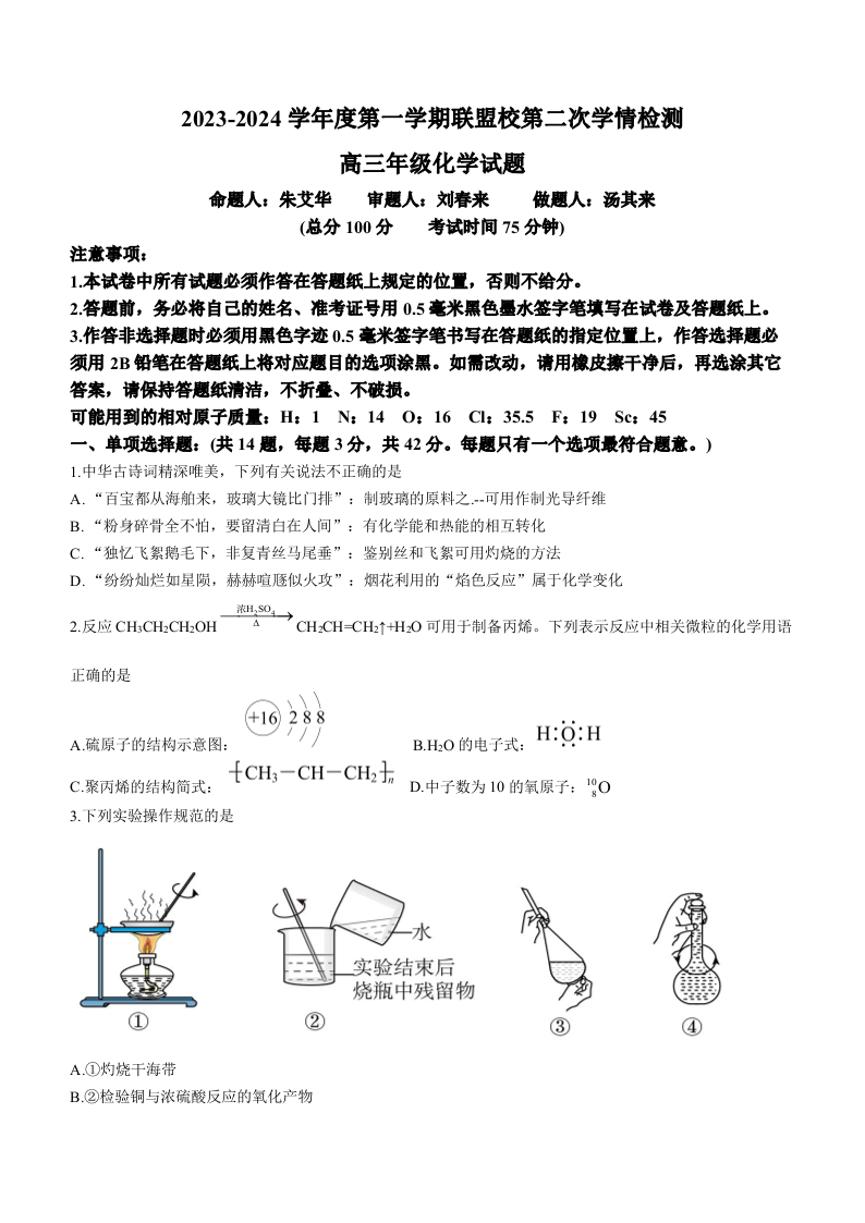 江苏省盐城市2023-2024学年度第一学期联盟校第二次联考 化学