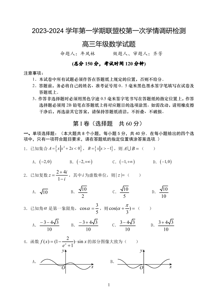 江苏省盐城市联盟校2023-2024学年高三上学期第一次学情调研检测 数学