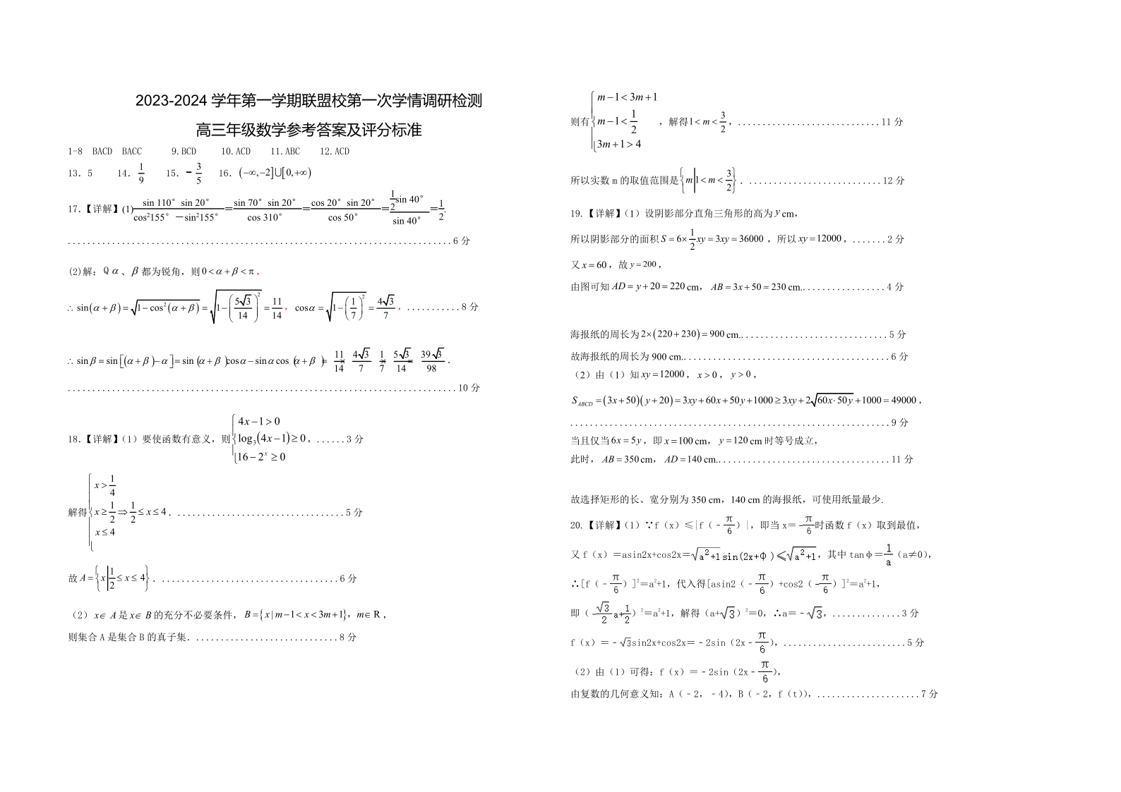 江苏省盐城市联盟校2023-2024学年高三上学期第一次学情调研检测 数学答案