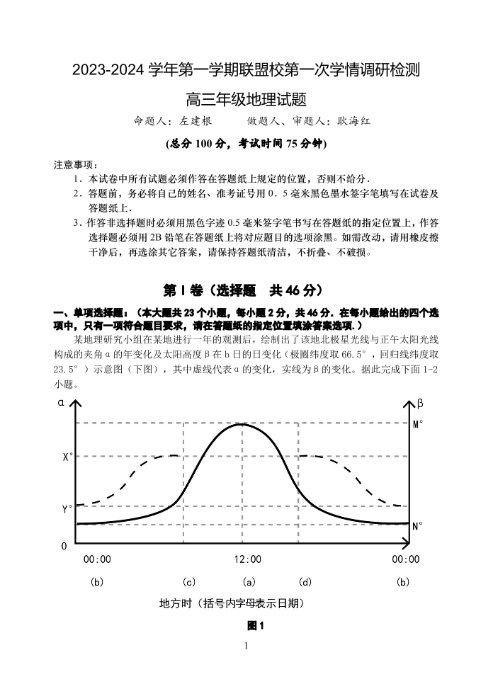 江苏省盐城市联盟校2023-2024学年高三上学期第一次学情调研检测 地理