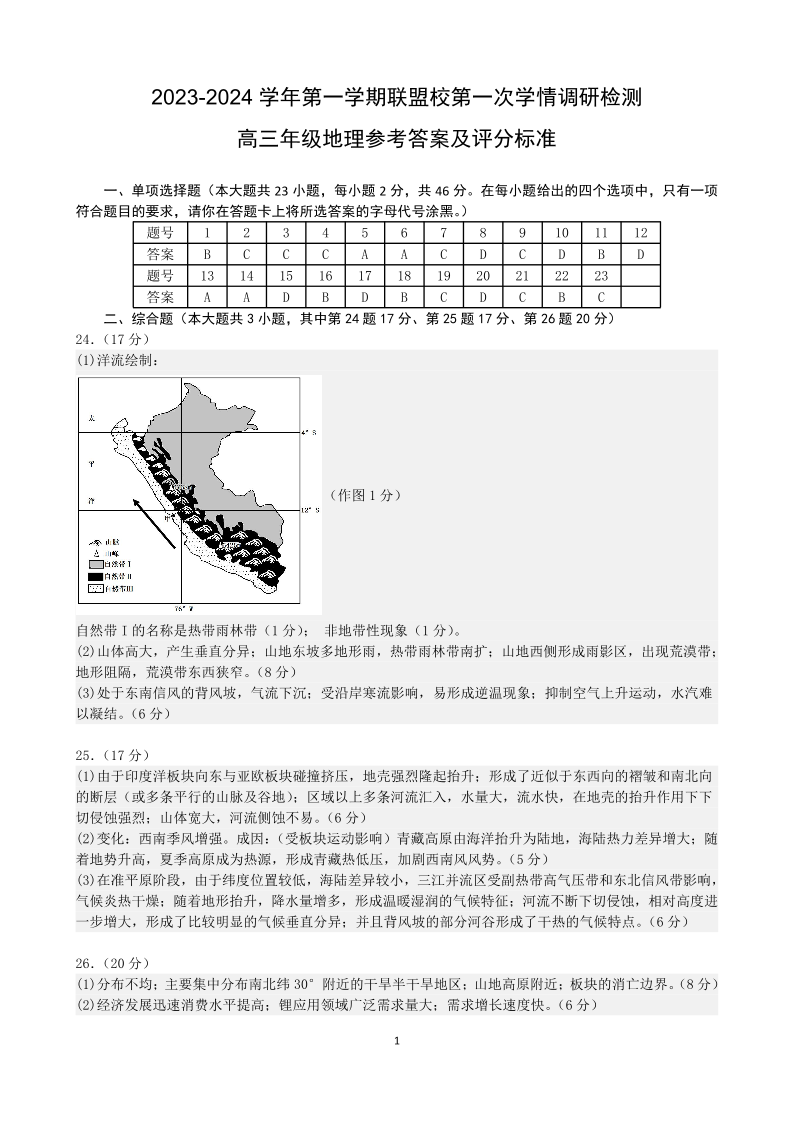 江苏省盐城市联盟校2023-2024学年高三上学期第一次学情调研检测 地理答案