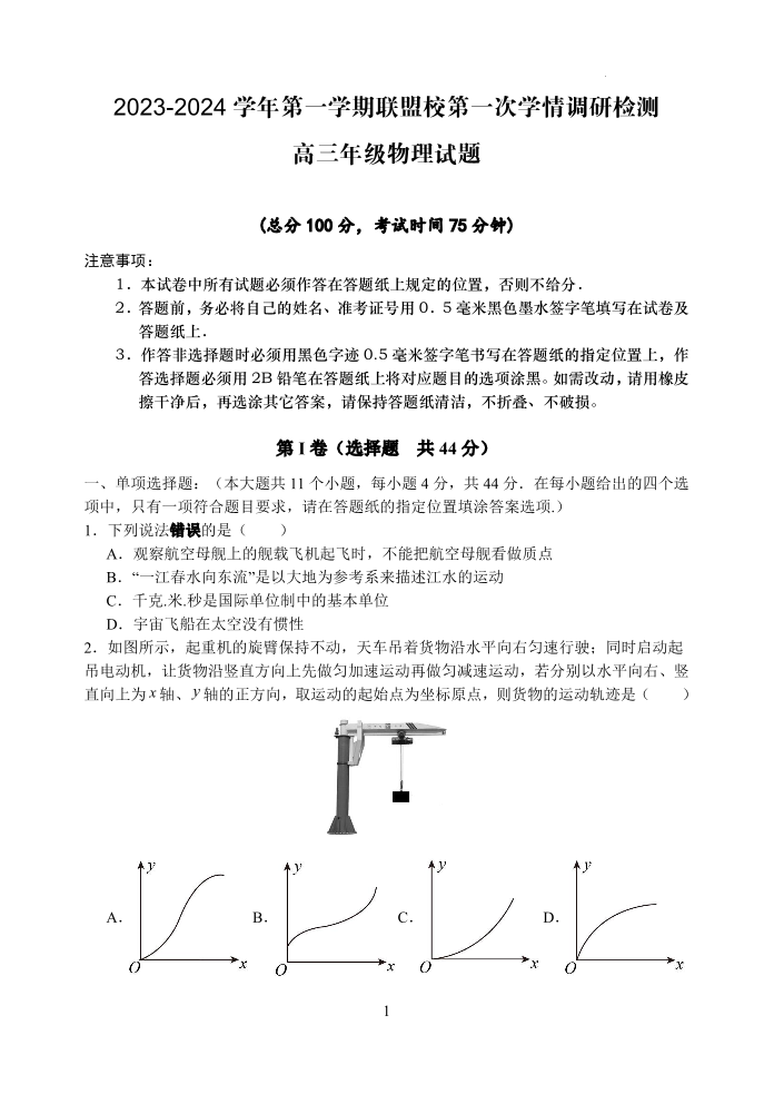 江苏省盐城市联盟校2023-2024学年高三上学期第一次学情调研检测 物理