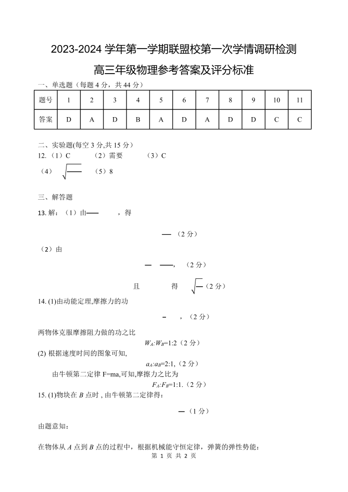 江苏省盐城市联盟校2023-2024学年高三上学期第一次学情调研检测 物理答案