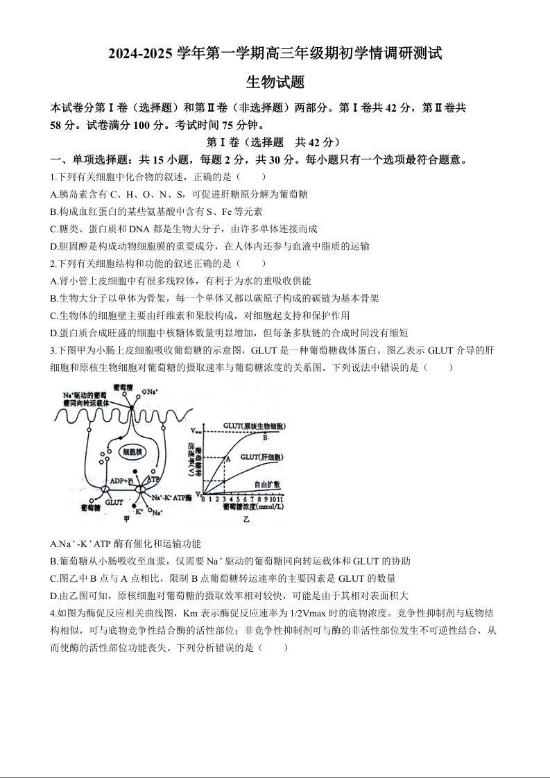 江苏省扬州市2024-2025学年高三上学期开学考试+生物