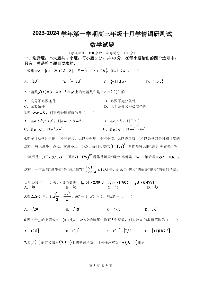 江苏省扬州市高邮市2023-2024学年高三上学期10月学情调研测试 数学