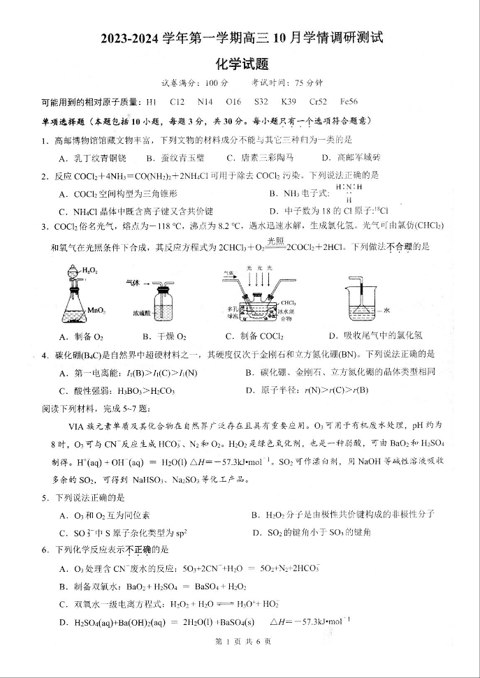 江苏省扬州市高邮市2023-2024学年高三上学期10月学情调研测试 化学