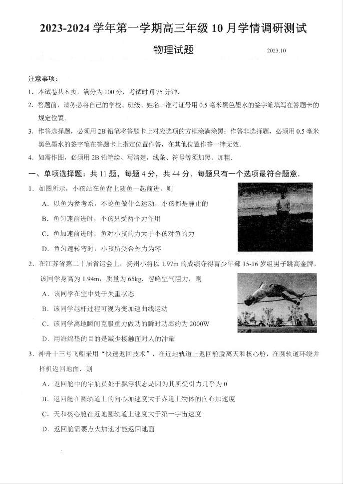 江苏省扬州市高邮市2023-2024学年高三上学期10月学情调研测试 物理