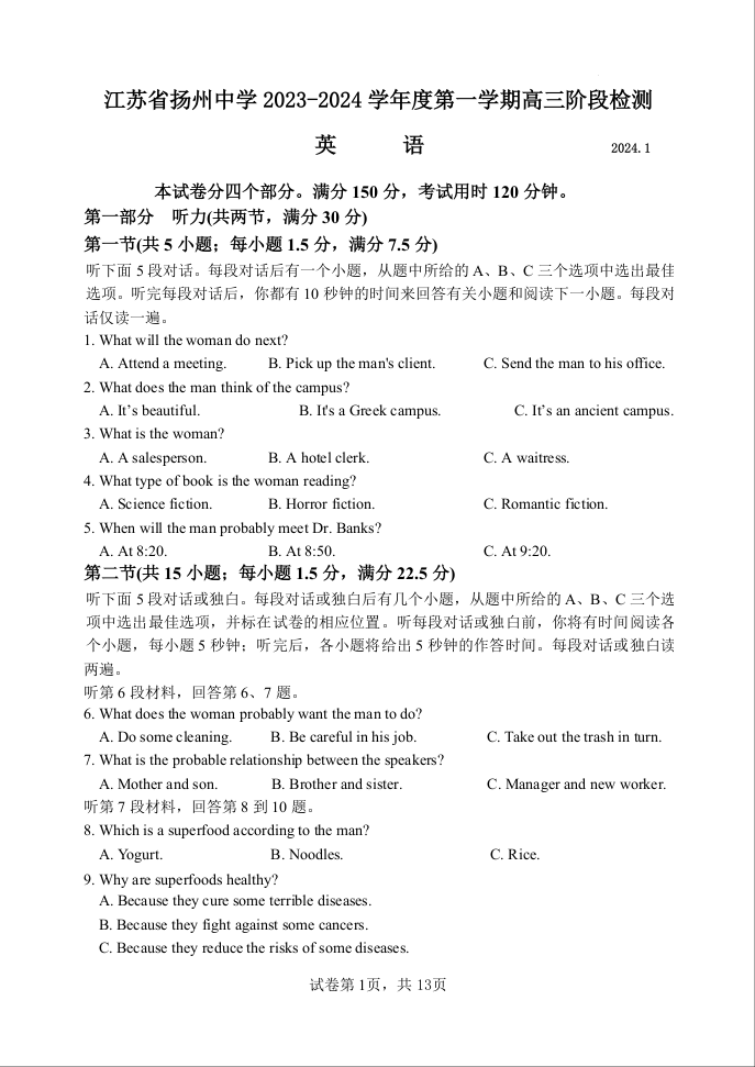 江苏省扬州中学2023-2024学年高三上学期1月月考 英语