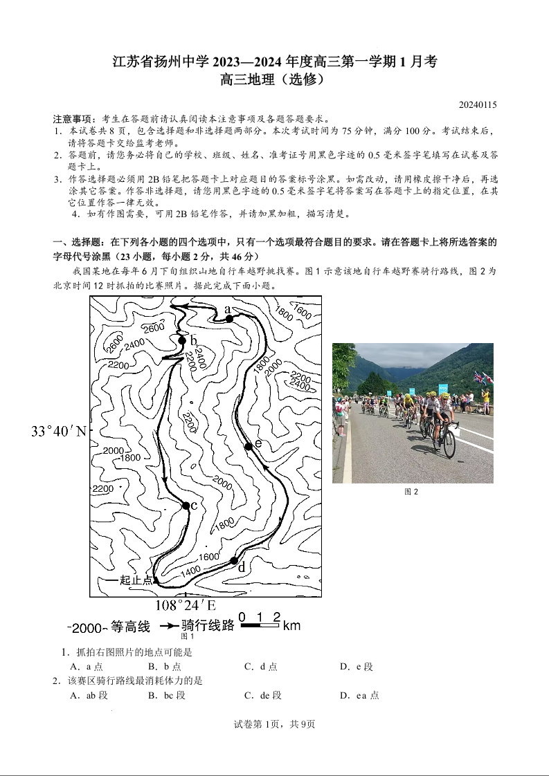 江苏省扬州中学2023-2024学年高三上学期1月月考 地理