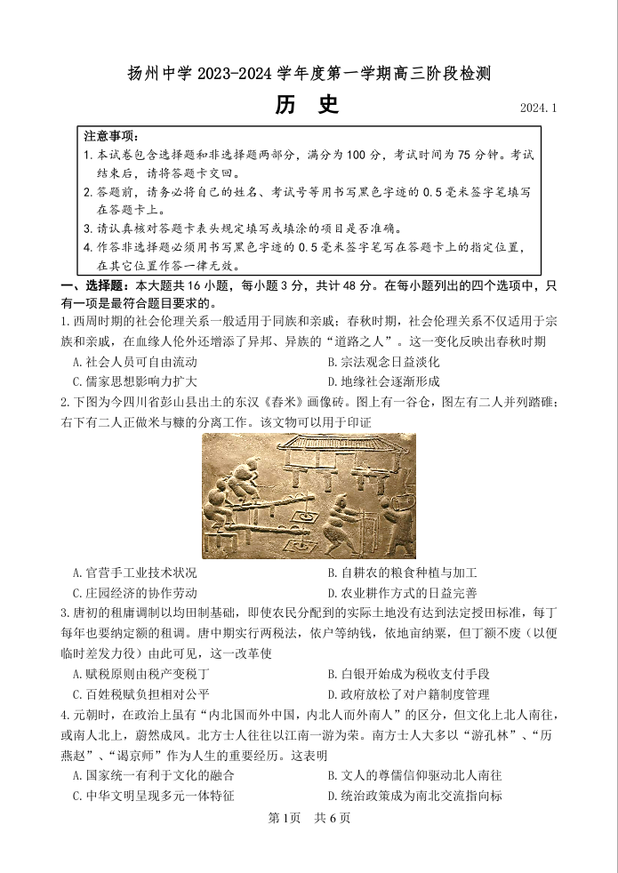 江苏省扬州中学2023-2024学年高三上学期1月月考 历史