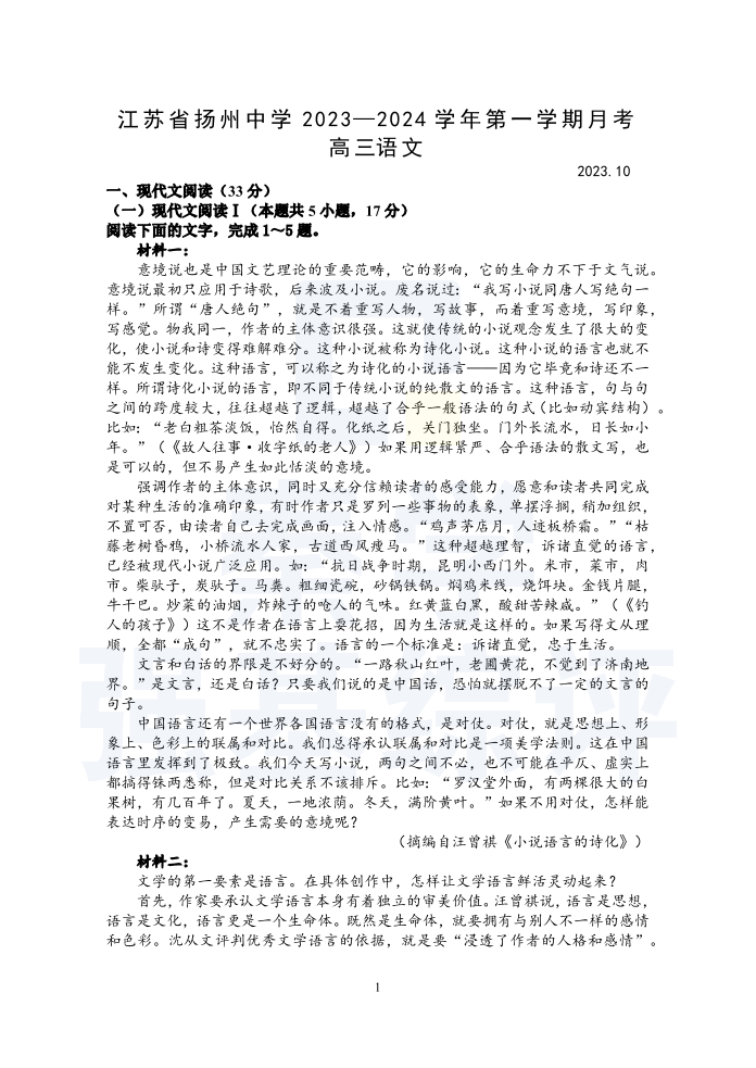 江苏省扬州中学2023-2024学年高三上学期10月月考 语文