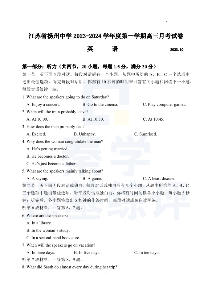 江苏省扬州中学2023-2024学年高三上学期10月月考 英语