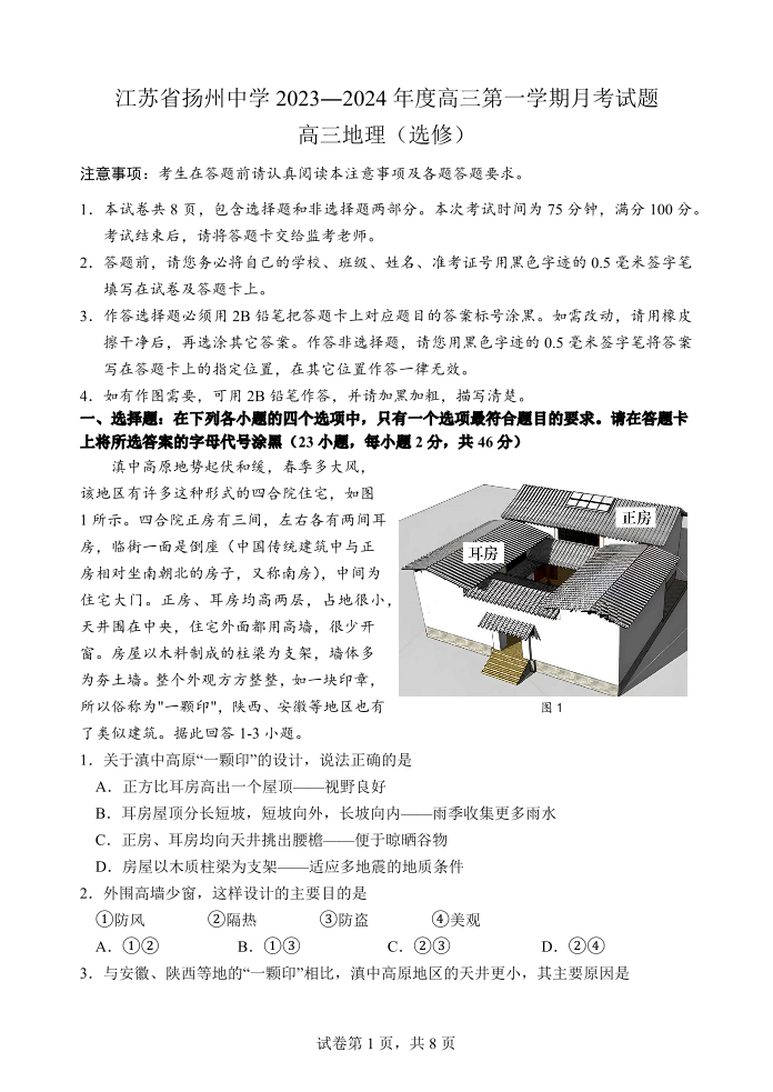 江苏省扬州中学2023-2024学年高三上学期10月月考 地理