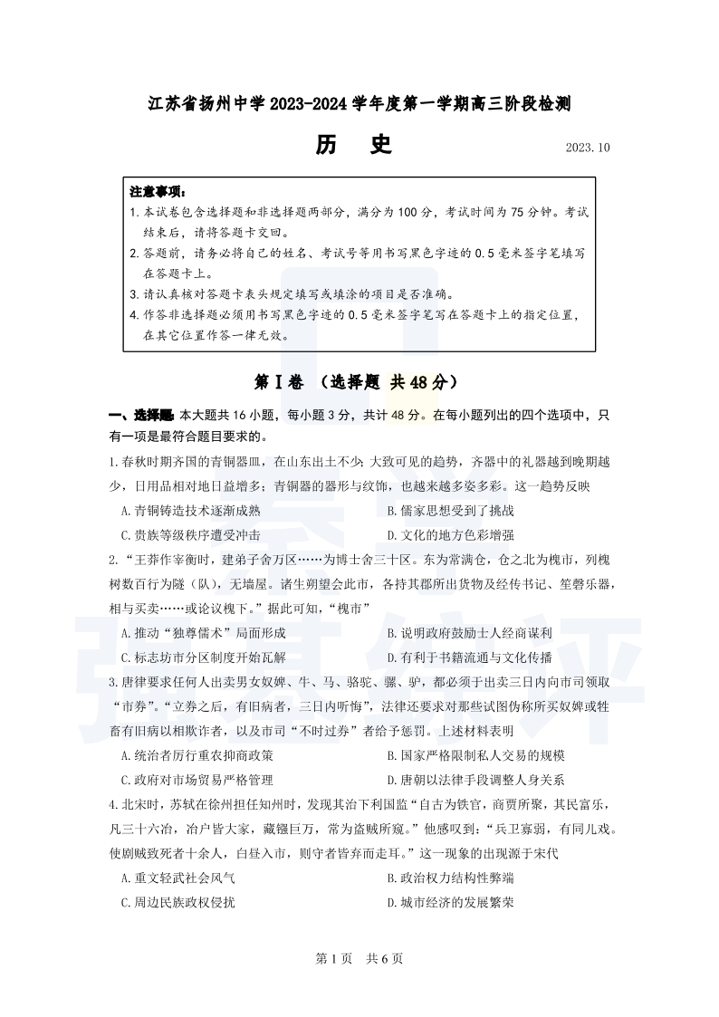 江苏省扬州中学2023-2024学年高三上学期10月月考 历史