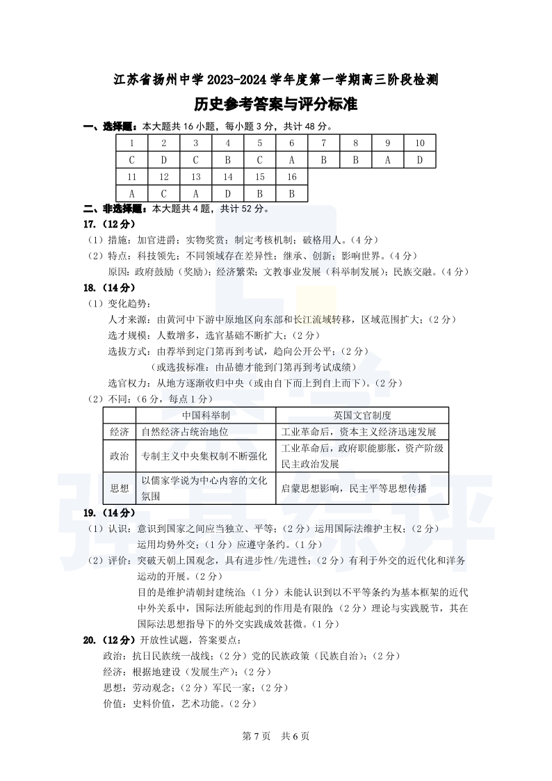 江苏省扬州中学2023-2024学年高三上学期10月月考 历史答案