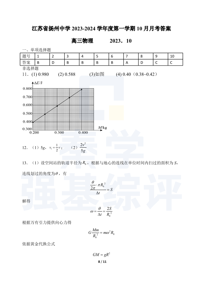 江苏省扬州中学2023-2024学年高三上学期10月月考 物理答案