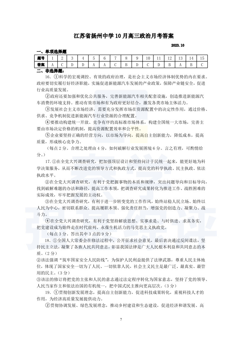 江苏省扬州中学2023-2024学年高三上学期10月月考 政治答案