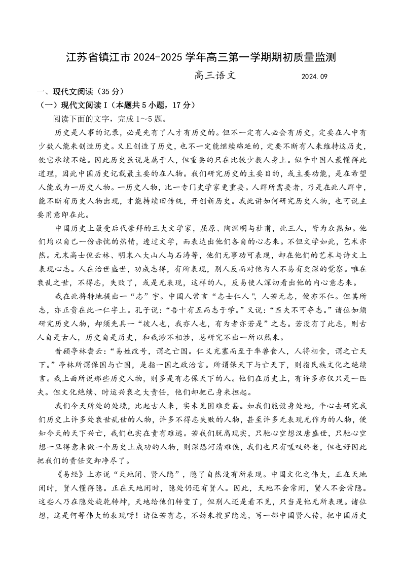 江苏省镇江市2024~2025学年第一学期期初高三质量监测+语文