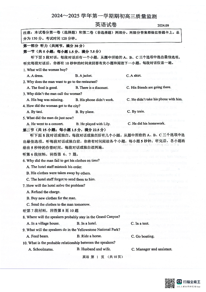 江苏省镇江市2024~2025学年第一学期期初高三质量监测+英语