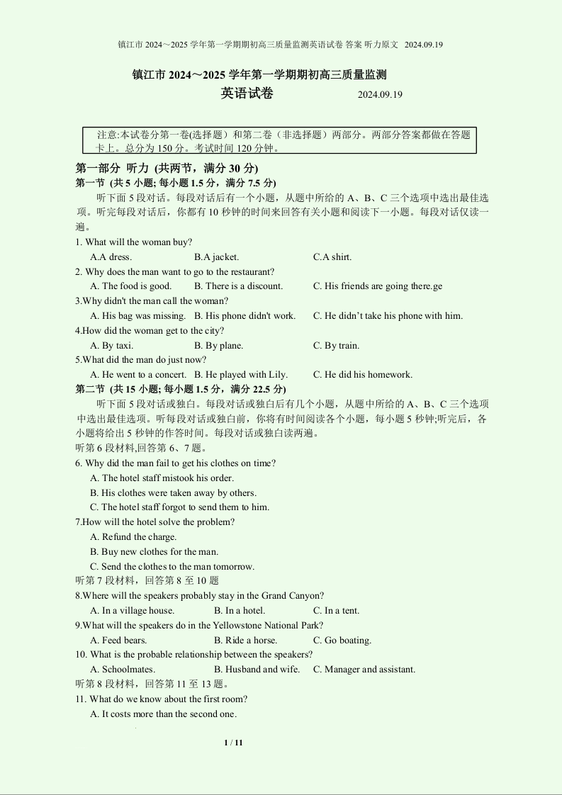 江苏省镇江市2024~2025学年第一学期期初高三质量监测+英语答案