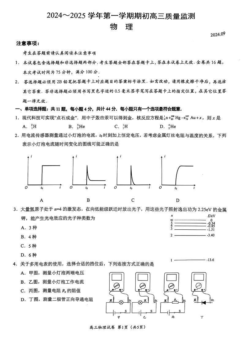 江苏省镇江市2024~2025学年第一学期期初高三质量监测+物理