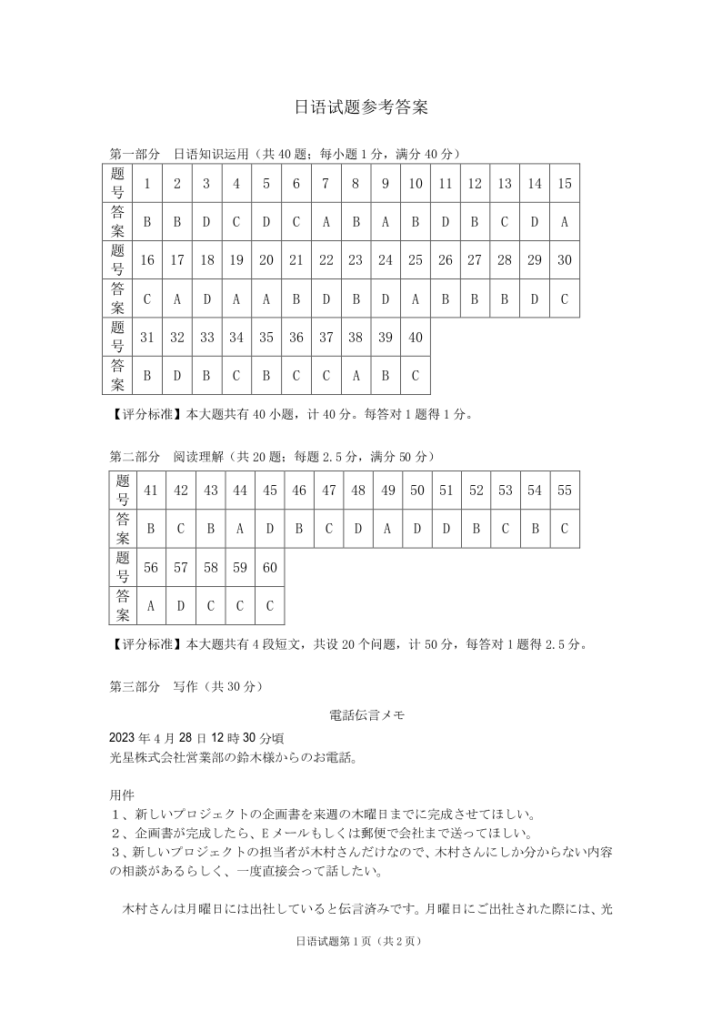 4山东省淄博市2023.4高三年级第二次模拟考试日语答案