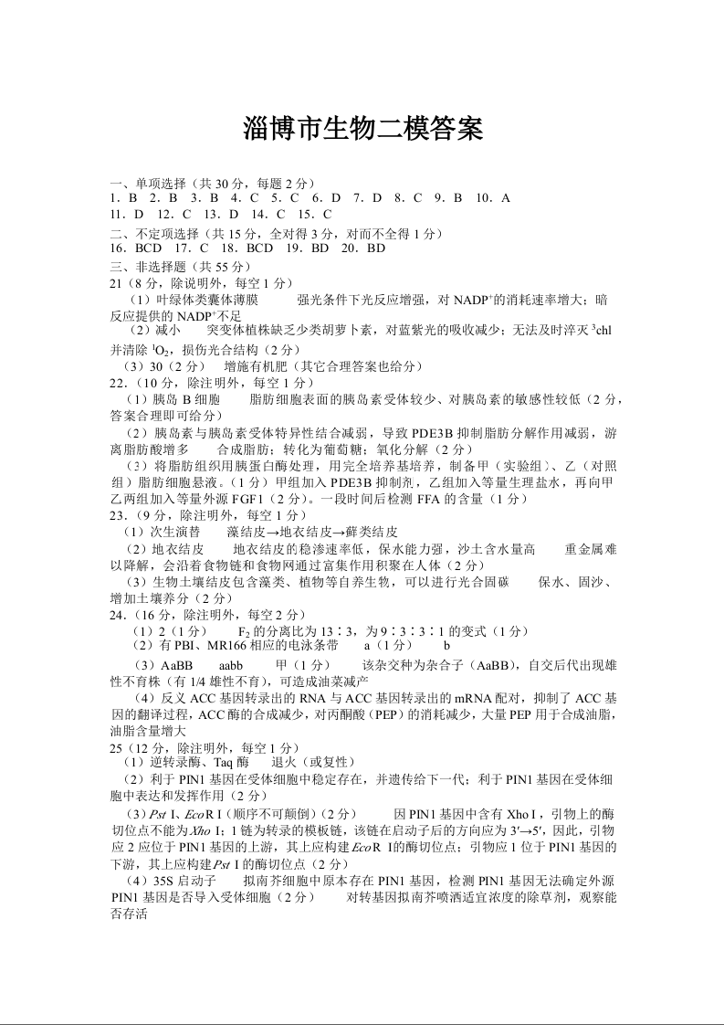 7山东省淄博市2023.4高三年级第二次模拟考试生物答案