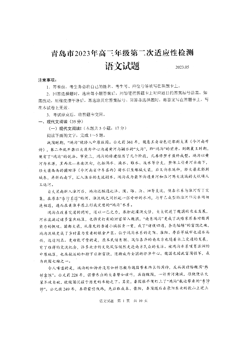 1山东省青岛市2023.5高三年级第二次模拟考试语文