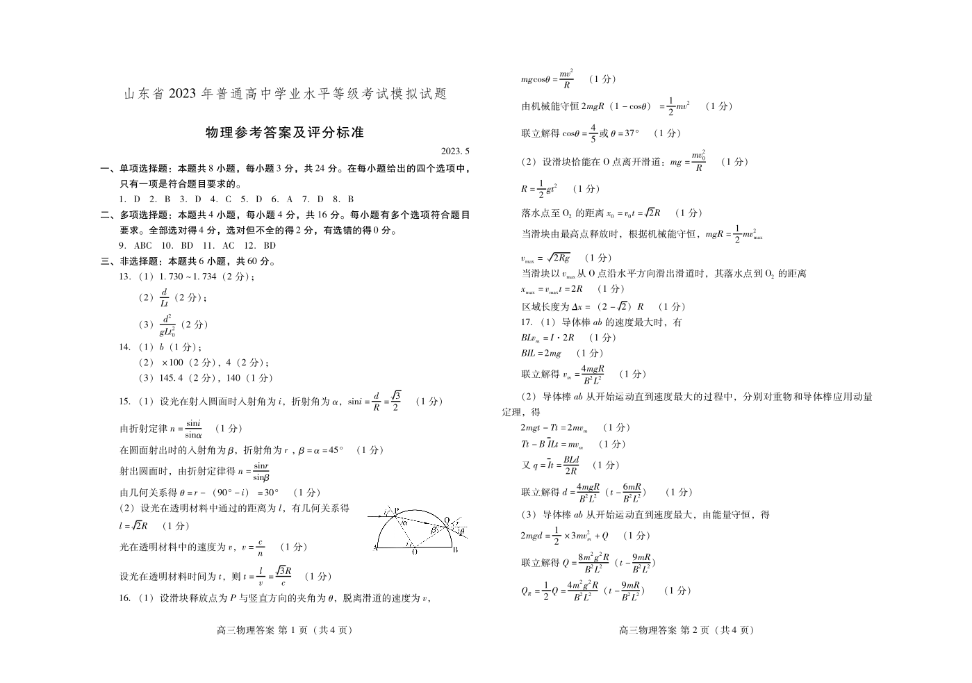 山东省潍坊市2023.5高三年级第三次模拟考试物理答案