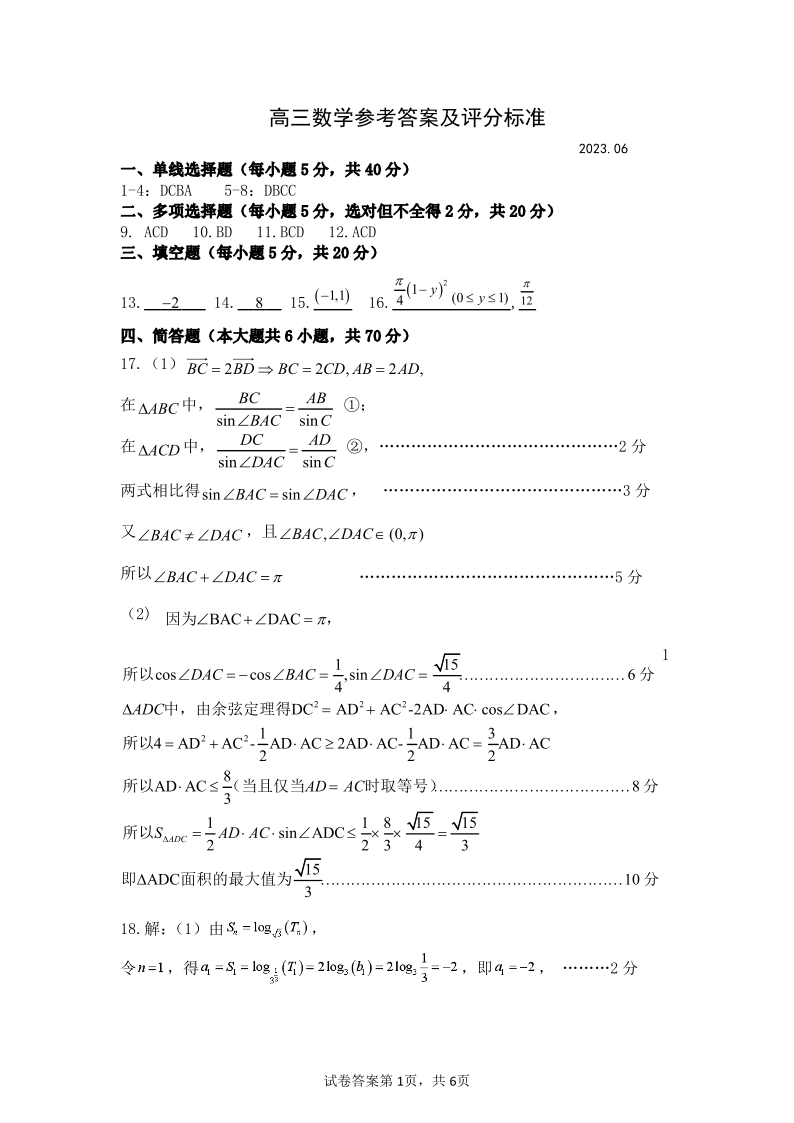 2山东省潍坊市区域2023.6高三年级考前模拟热身数学答案