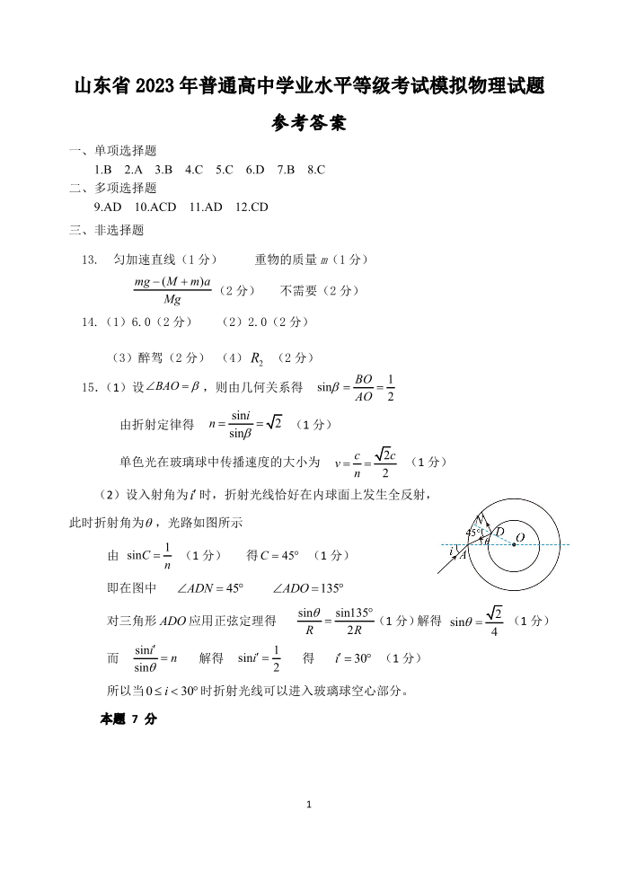 山东省潍坊市区域2023.6高三年级考前模拟热身物理答案