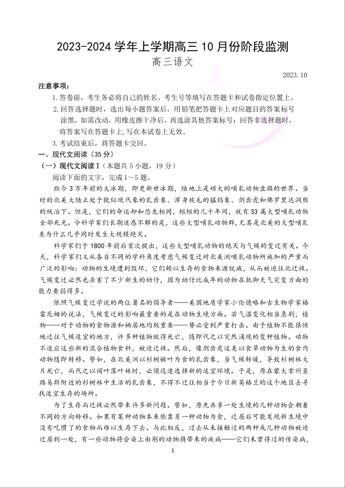 山东省潍坊市五县市2023.10高三年级阶段监测语文