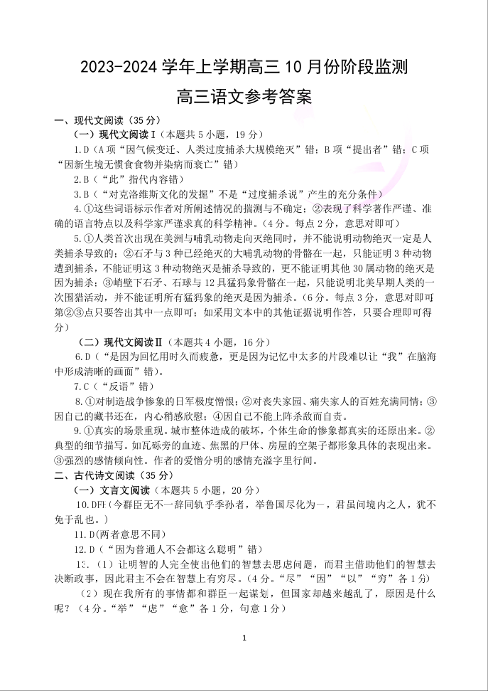 山东省潍坊市五县市2023.10高三年级阶段监测语文答案