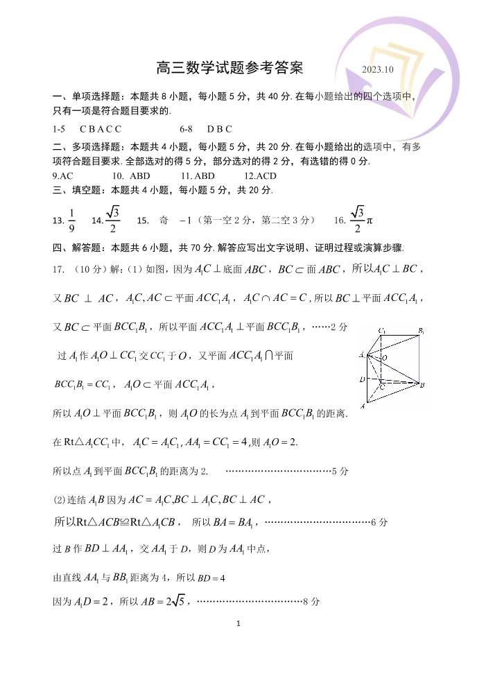 山东省潍坊市五县市2023.10高三年级阶段监测数学答案