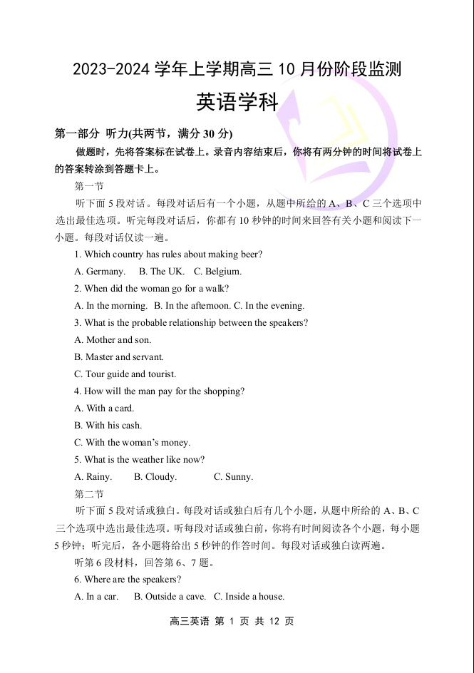 山东省潍坊市五县市2023.10高三年级阶段监测英语