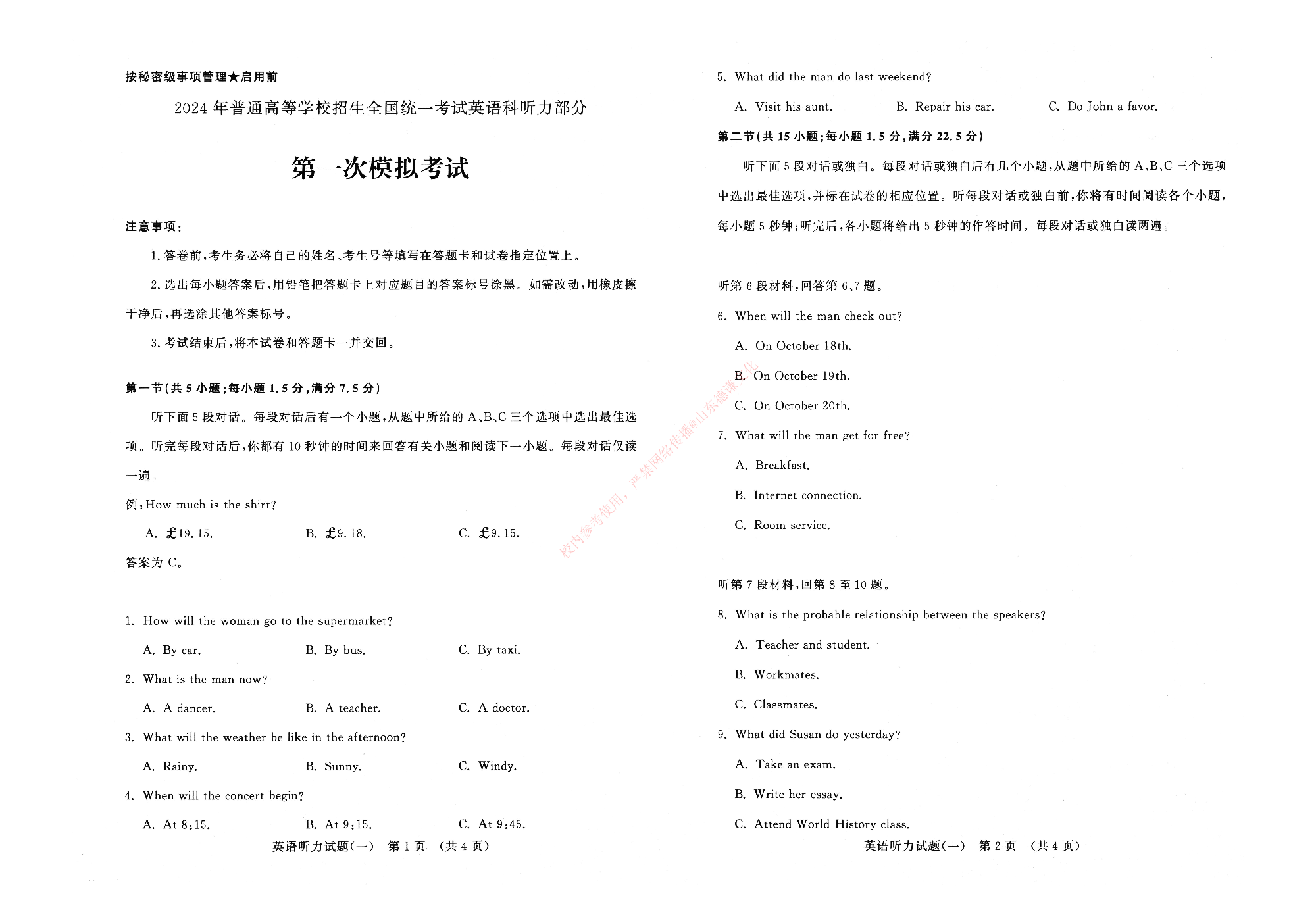 山东省济南市2023.12高三年级英语听力考前模拟试题一