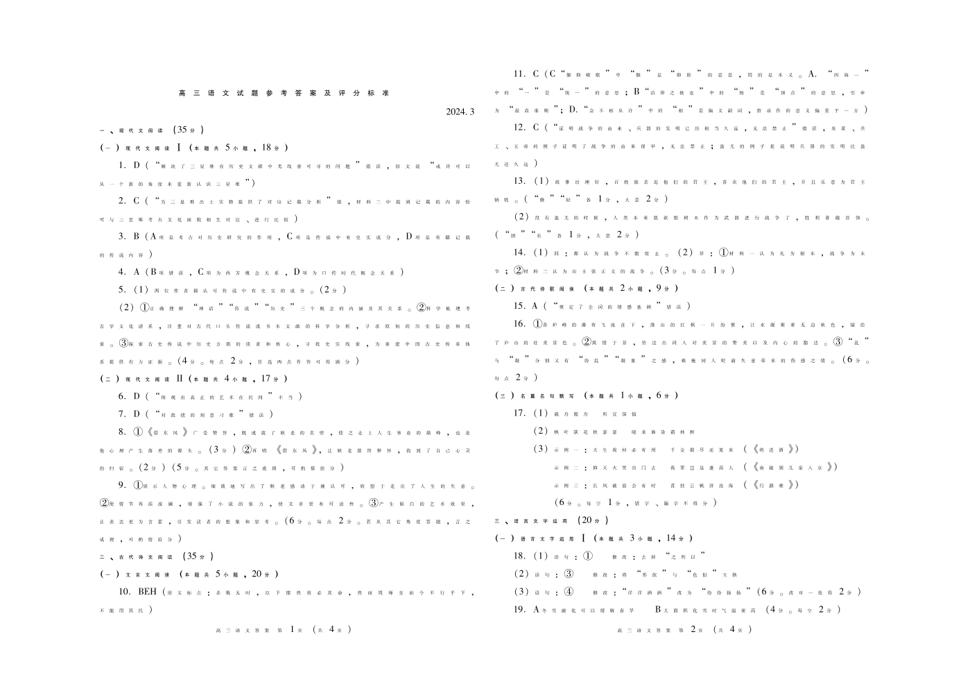 1山东省潍坊市2024.3高三年级第一次模拟语文答案