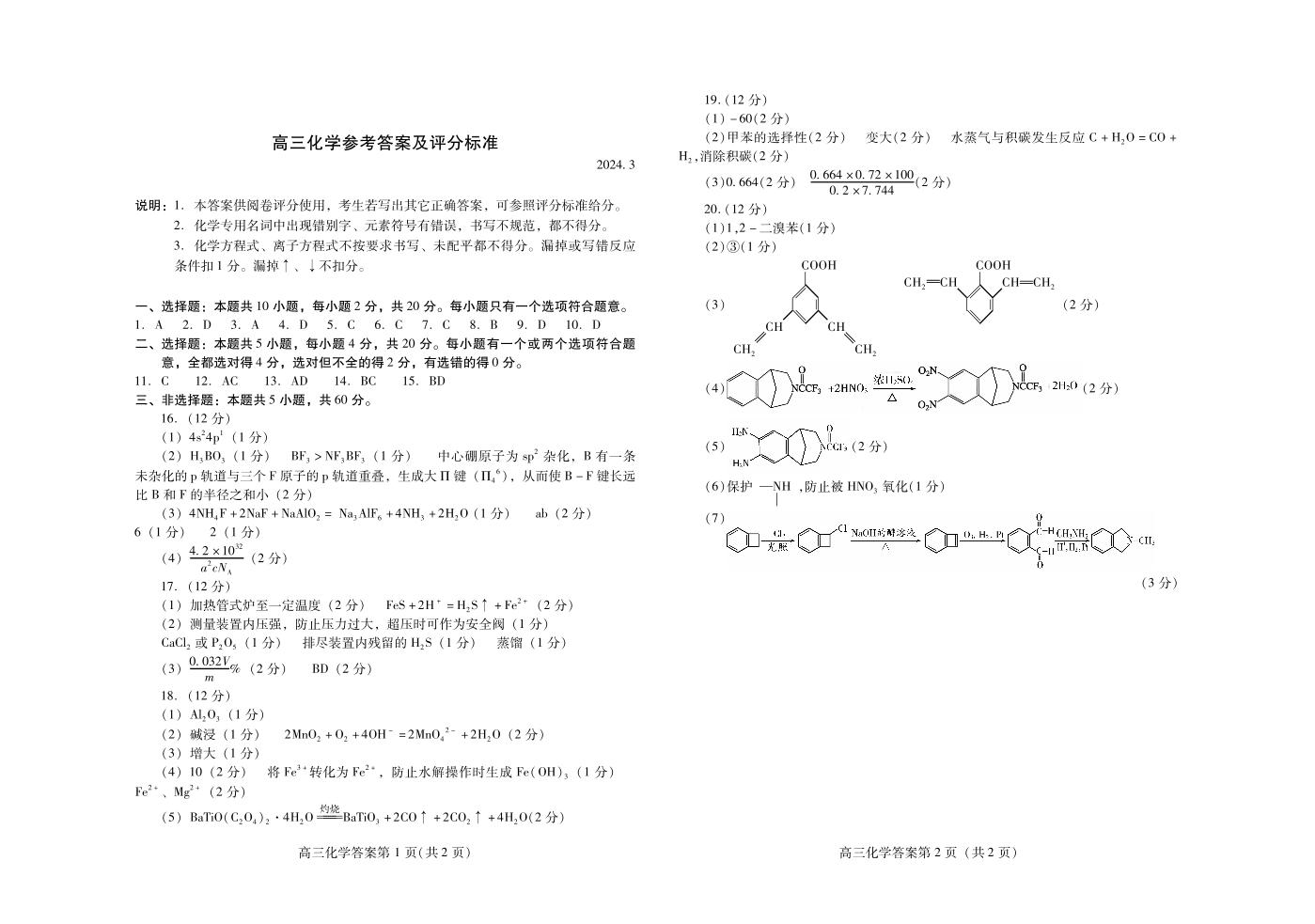 山东省潍坊市2024.3高三年级第一次模拟化学答案