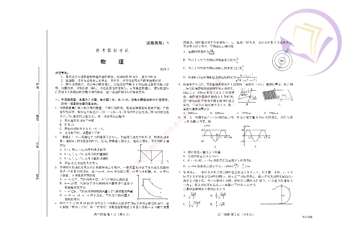 山东省潍坊市2024.3高三年级第一次模拟物理