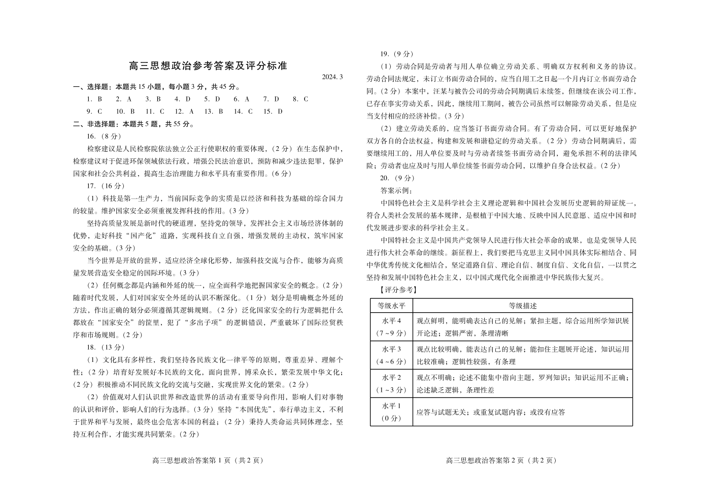 山东省潍坊市2024.3高三年级第一次模拟政治答案